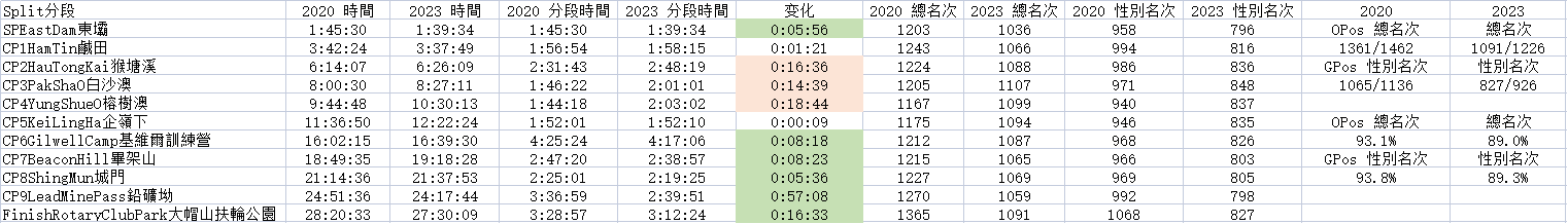 从时间来看,相比于2020年的港百,这一次在前半程速度有所下降,下降了45分钟,而后半程则比之前快了95分钟。原因主要在于期望的变化。2020年第一次参加港百,不知道体力分布和赛道的具体情况,当在前半程感觉自己可以拿到小铜人,甚至可以冲击小银人的时候,就会疯狂的冲冲冲,所以前半程速度就快了很多,但实际上总体用时是不能用前半程的用时来乘以2来直接计算的,毕竟针草帽这三座大三的难度还是有的。而2023年的港百在去CP3的路上时候就感知到了自己无法拿到小铜人了,所以速度也就慢下来了。而后期则是因为两点,速度要比2020年那次快很多,第一个原因是负伤情况相对较轻,2020年膝盖受伤,脚底起泡,而2023年则是只有一个磨裆,所以会轻松一些。第二个原因则是这次学会了臀部发力,因此在过程中对股四的压力就小了很多了。