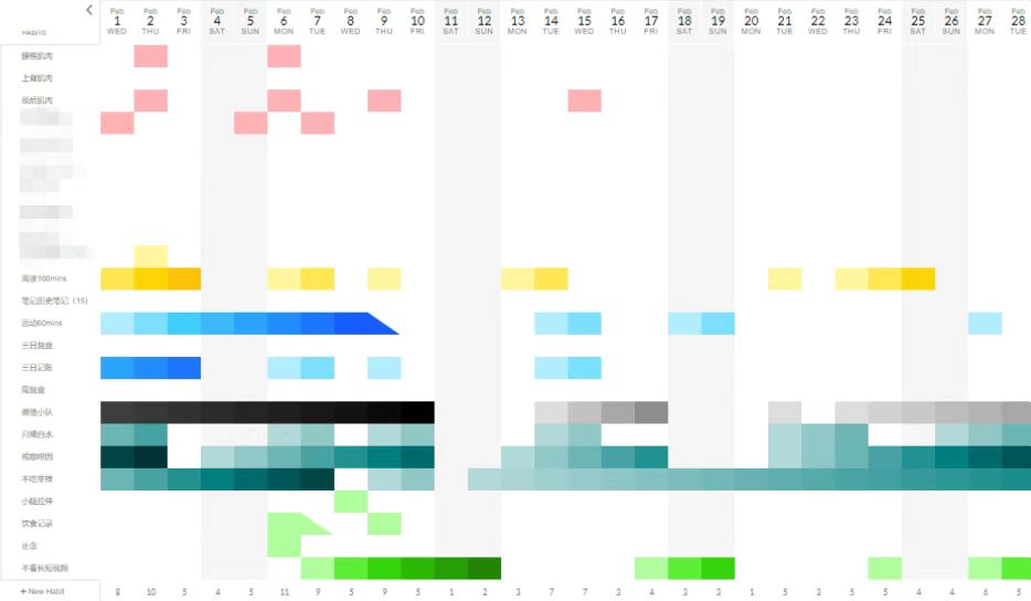 2月份新增了4个flag:拉伸小腿、正念、记录饮食、不看长短视频等。但是目前来看几乎都是完败的,除了不看长短视频这个还能有一定的实践,剩下三个几乎没有什么行动,感觉自己立这三个flag的时候大意了。3月份要去掉这3个flag了。