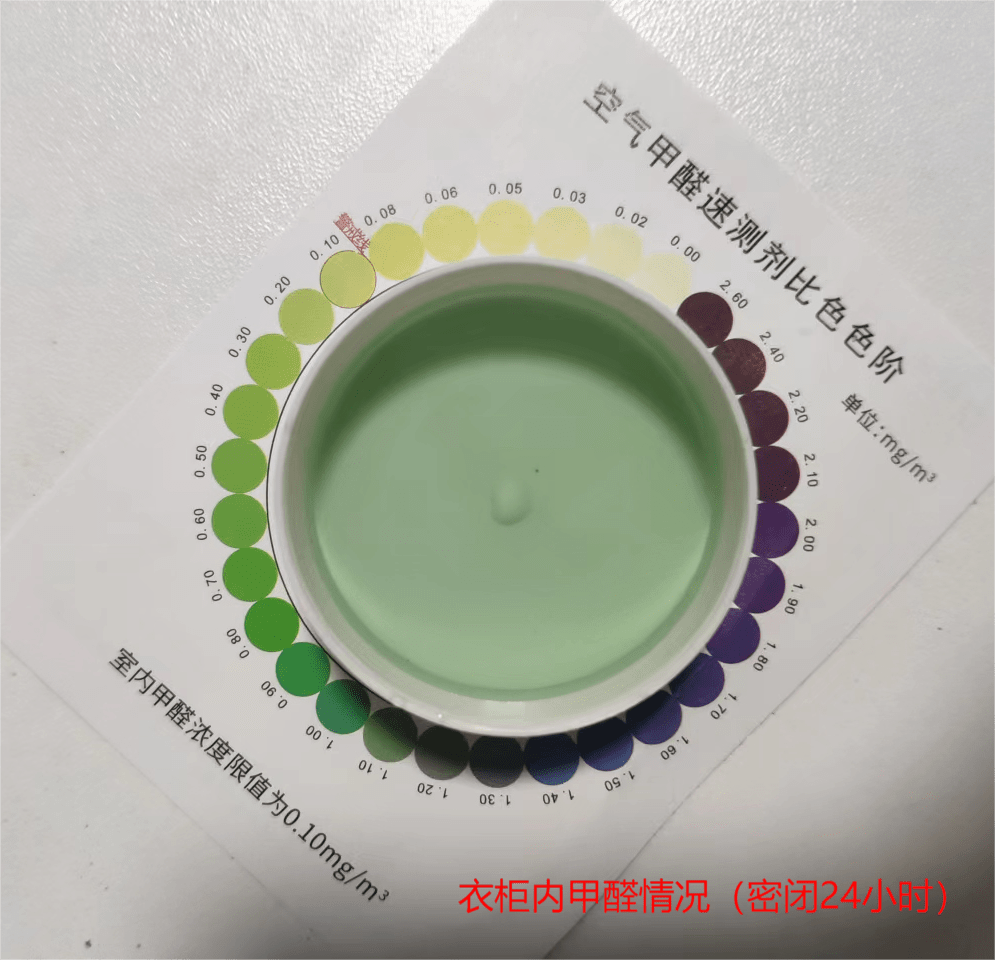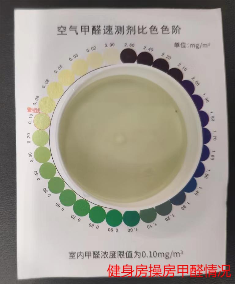 后来想了想,还是决定去看看这家新开的健身房到底有没有甲醛超标的问题,毕竟如果自己想去这家健身房的话,甲醛超标还是比较危险的。于是网上买了两种测量甲醛的工具,一种是电子版手持版的,一种是溶液药水版本的。到货后,现在自己家里试了试两种测试方式,感觉差别不大,数据显示的差距还是比较大的,但是在大小方面是一致的。我选择的是两个地方,一个是卧室,另一个是甲醛比较浓郁的衣柜,得到的结果如下:
