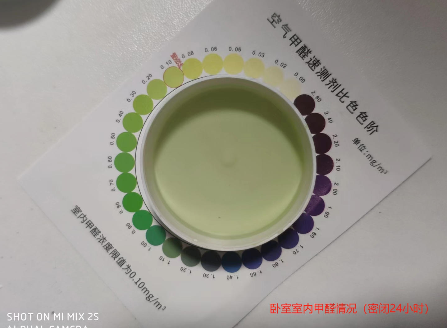 后来想了想,还是决定去看看这家新开的健身房到底有没有甲醛超标的问题,毕竟如果自己想去这家健身房的话,甲醛超标还是比较危险的。于是网上买了两种测量甲醛的工具,一种是电子版手持版的,一种是溶液药水版本的。到货后,现在自己家里试了试两种测试方式,感觉差别不大,数据显示的差距还是比较大的,但是在大小方面是一致的。我选择的是两个地方,一个是卧室,另一个是甲醛比较浓郁的衣柜,得到的结果如下: