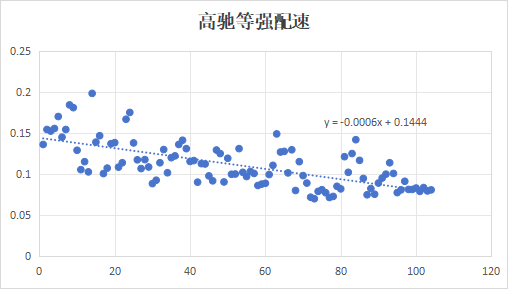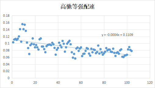 得到的结果是每前进一公里,自己的体能会持续下降,影响速度,每公里会下降0.6米/分钟。嗯,几乎和高驰的计算结果一样,区别在于启示速度不同,这个是因为自己在累计下降方面和高驰系统的处理方式不一样吧,毕竟我是按照自己之前的运动数据计算出来的结果,不过影响不大。