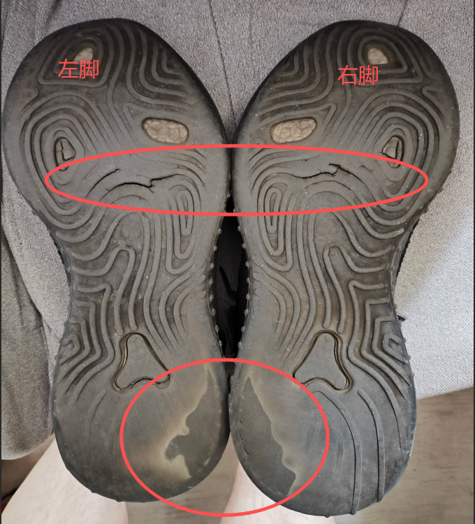 鞋子还算均衡,左右脚出现问题的地方比较明显,即双脚鞋底脚后跟外侧磨损相对严重,而脚掌部分则是脚掌内侧相对严重,而这双鞋甚至部分鞋底还有了裂痕。而鞋垫方面也是和鞋底类似,只不过左脚的脚后跟方面相对磨损轻微。对应的还有一个问题,这双鞋没有体现出来,因为这双鞋的鞋面很结实,而质量一般的鞋的鞋面的双脚大脚趾部分会有破洞。这三个特征也是我之前穿鞋用鞋得到的结果,和几年前一致。