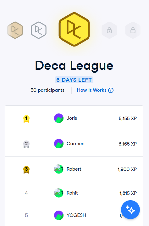 datacamp也找到了一个类似于多领国的leadboard,不过这个只有网页端有,app端没有,不过这个可以证明上周的事情,毕竟上周如果没有达标,这周是不会晋级的。